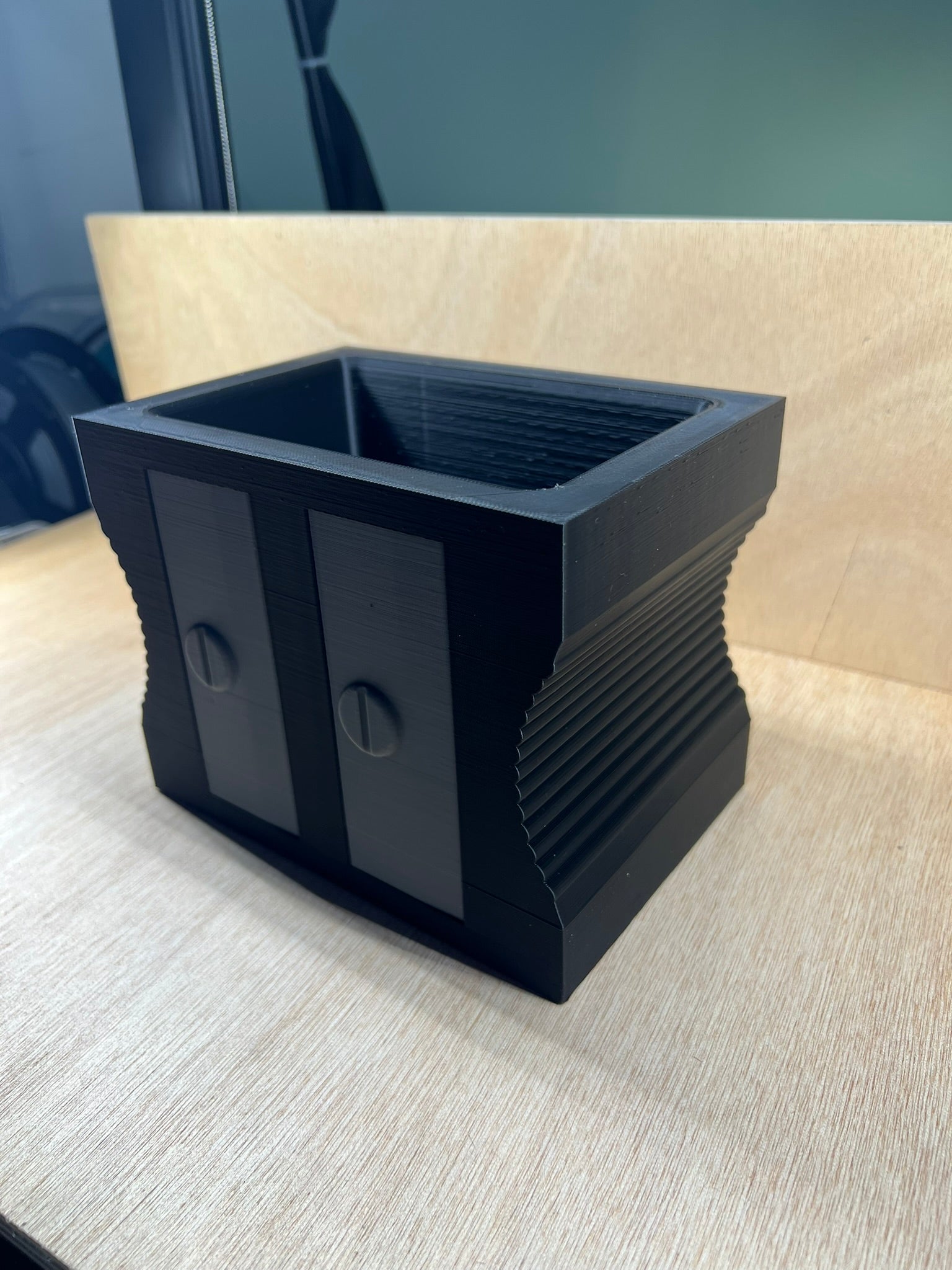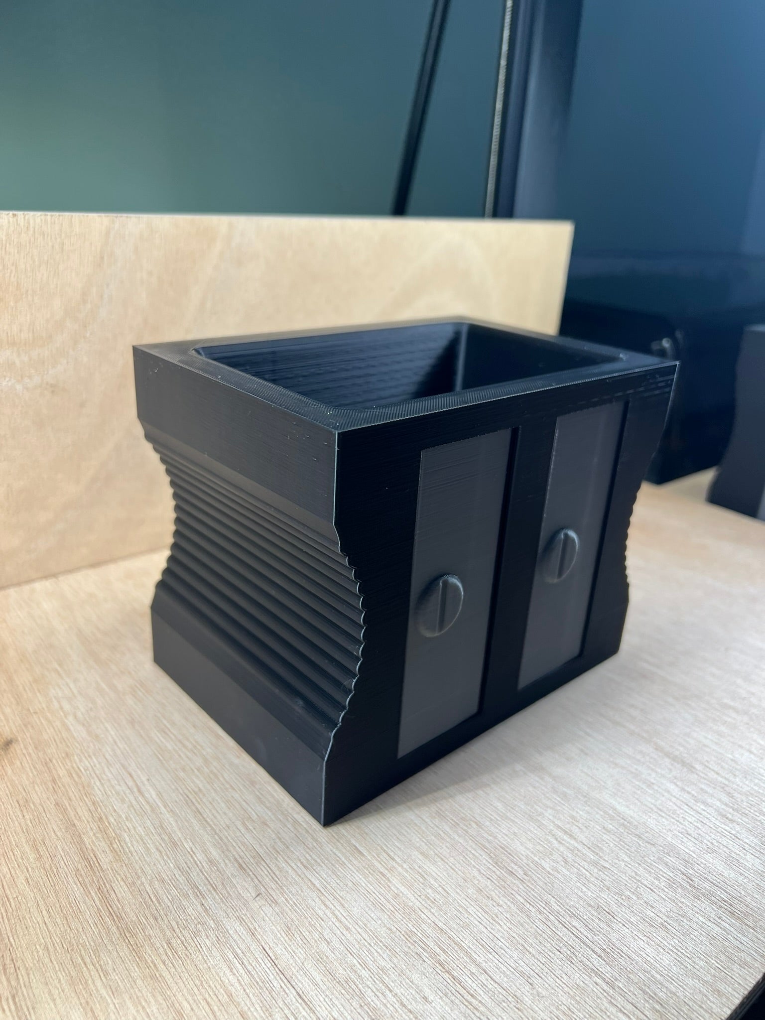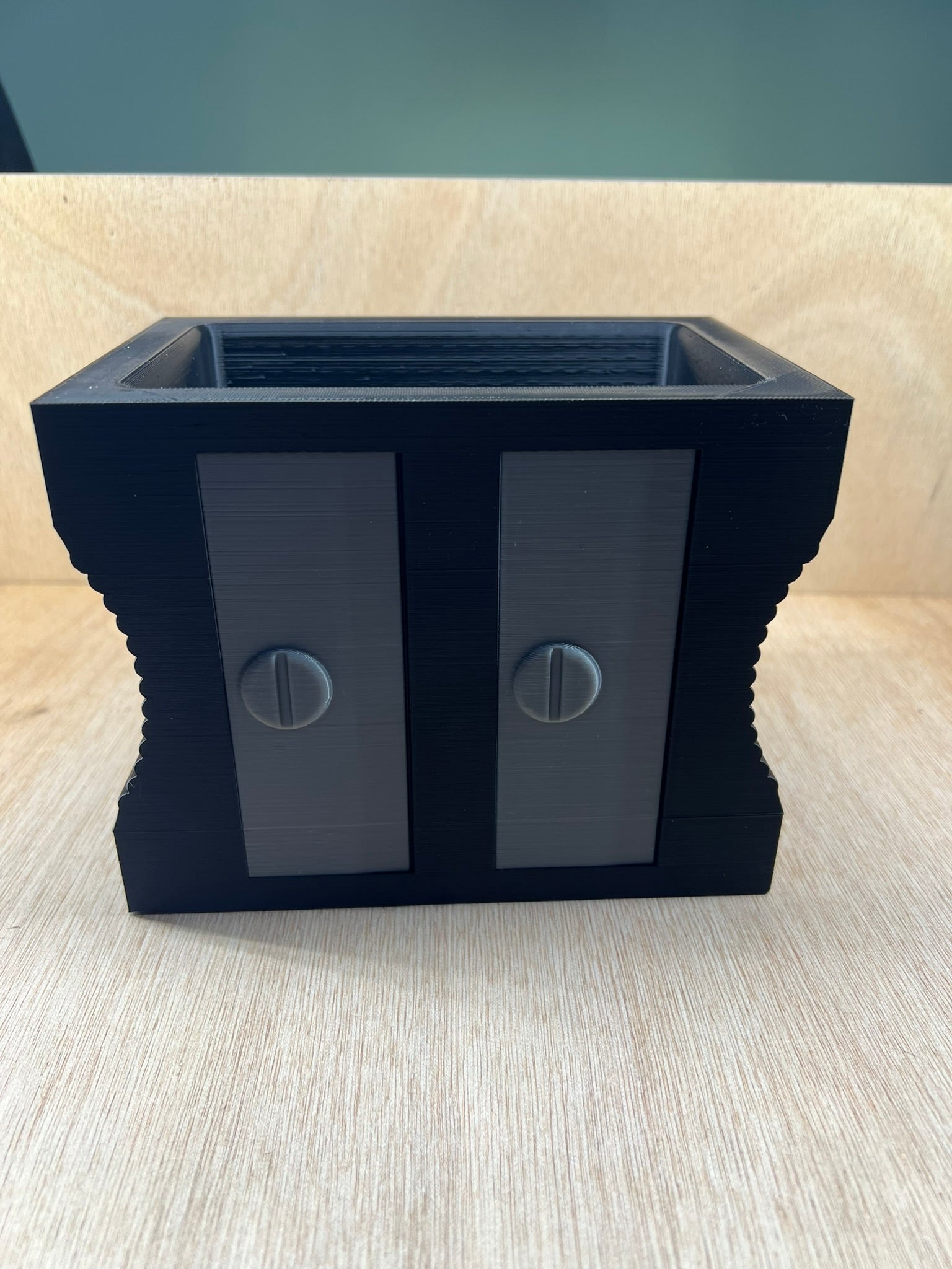 Ce pot à crayons unique, entièrement réalisé en impression 3D, reprend fidèlement l’apparence d’un taille-crayon à double lames, avec un rendu réaliste et une finition soignée en deux couleurs contrastées (noir et gris). Il s’agit d’un objet à la fois fonctionnel et décoratif, parfait pour un bureau ou un espace créatif.
